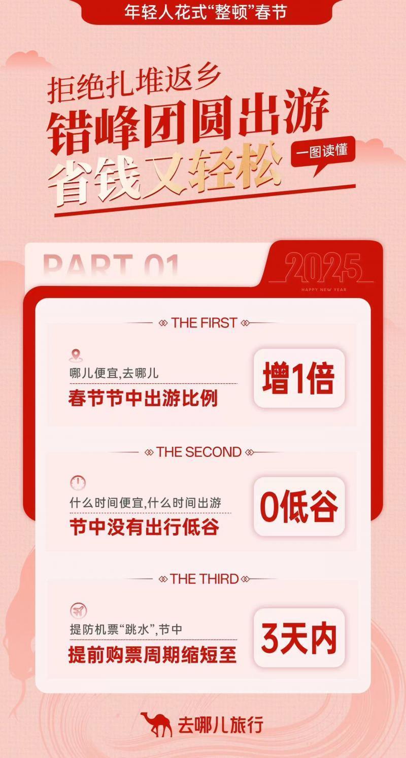 部分单位提前放假,加上不少打工人选择“请2休11”,导致这个春节假期出行高峰不断。去哪儿大数据显示,今年春节节前出行高峰提前至1月25日。机票价格从1月26日开始回落,至除夕到达相对低点,引得很多人看准低票价“踩点”回家。从初一开始,出行人数又开始快速回升,初二到初五的出行量明显高于去年春节同期,节中没有出行低谷。