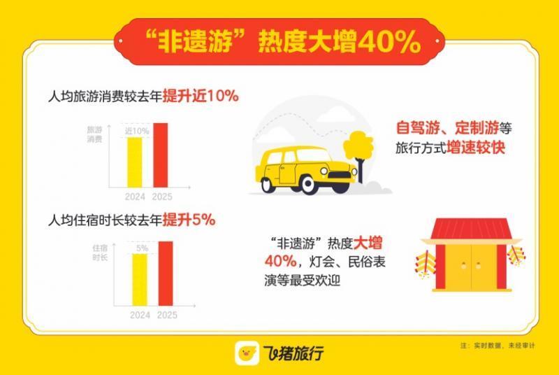 2025年是首个“非遗”春节,追着非遗过大年成为这个假期旅游市场的“顶流”。飞猪数据显示,包含非遗景点、非遗体验的“非遗游”热度较去年大增40%,携亲友逛灯会、赏民俗表演等内容最热门。特色民俗和非遗体验成为民宿王牌体验。春节期间,途家平台上“春节”、“过年”、“民俗”、“非遗”等关键词搜索量同比增长4.2倍。6人游平台上,潮汕等地凭借浓厚的春节氛围,吸引大批游客纷至沓来。英歌舞、舞龙舞狮等传统民俗活动,成为春节期间备受游客喜爱的体验项目。
